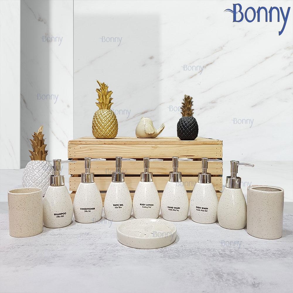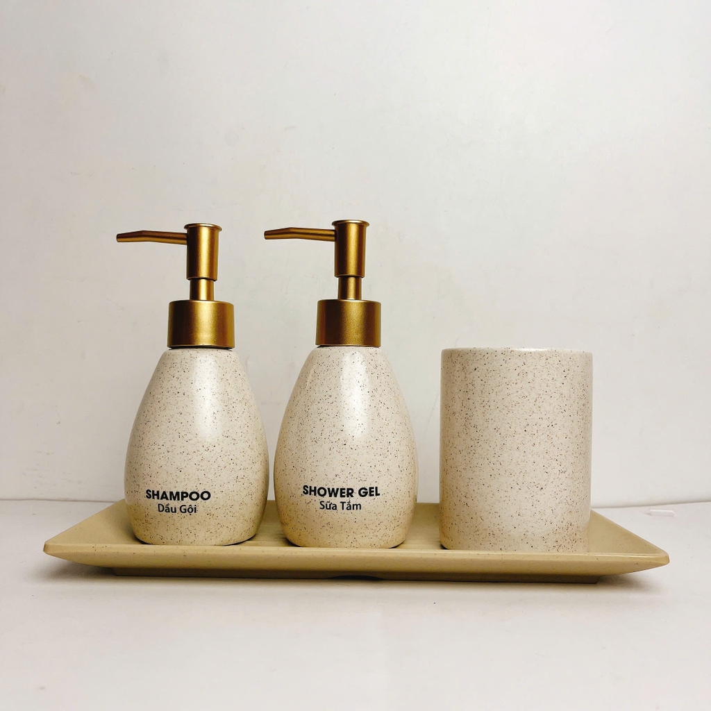 - Tên sản phẩm: Bộ sản phẩm bình đựng trong phòng tắm gồm bình đựng nước rửa tay, dầu gội, sữa tắm, Khay xà bông, cốc đánh răng, ống cắm bàn chải.